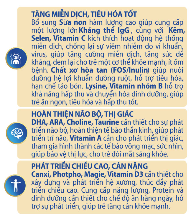 FRANCI COLOSTRUM GOLD có hàm lượng kháng thể cao IgG 1200 mg từ sữa non Colostrum tự nhiên, được nhập khẩu hoàn toàn từ Mỹ giúp trẻ tăng cường miễn dịch, tăng sức đề kháng. Đồng thời, DHA, Omega 3-6 cùng chiết xuất tổ yến giúp phát triển não bộ và thị giác, cải thiện tiêu hóa, tăng cường hấp thu.