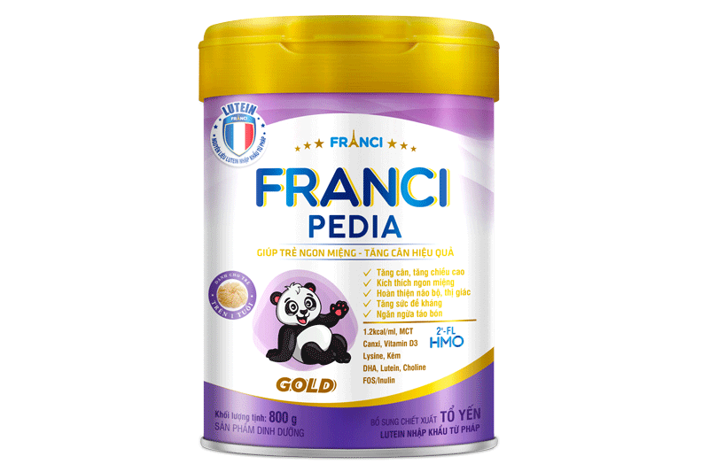 FRANCI PEDIA GOLD là sản phẩm bổ sung năng lượng, protein và vi chất dinh dưỡng, giúp trẻ ăn ngon miệng, tăng cân và phát triển khỏe mạnh. Với công thức dinh dưỡng cao năng lượng 1.2cal/ml giúp trẻ gầy yếu tăng cân nhanh. Sản phẩm còn bổ sung 2’-FL HMO, một prebiotic tự nhiên là dưỡng chất vàng có nhiều nhất trong sữa mẹ, giúp tăng cường miễn dịch cùng chiết xuất tổ yến kích thích cảm giác ngon miệng, thúc đẩy quá trình chuyển hóa dinh dưỡng trong cơ thể.